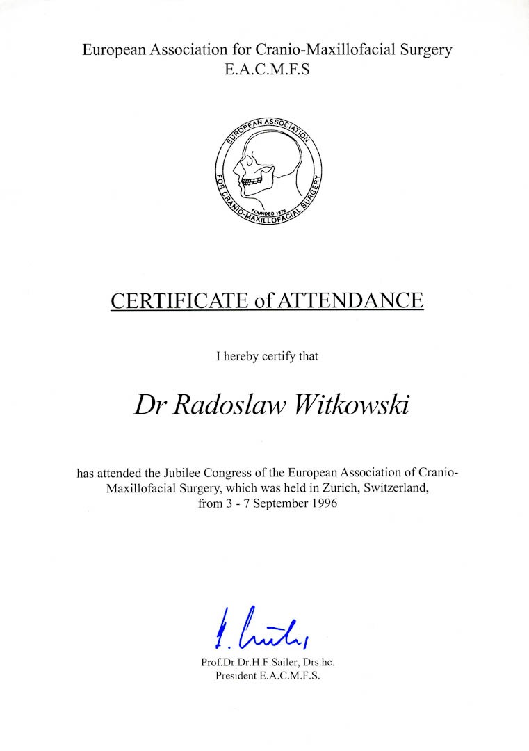 Certyfikat 1996.09.03 E.A.C.M.F.S Zurych Szwajcaria