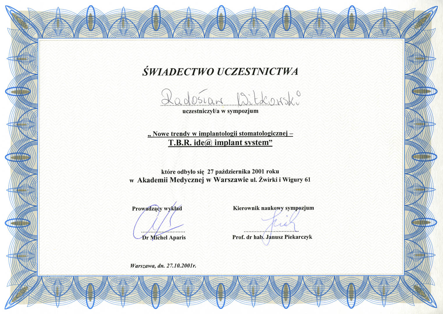 Certyfikat 2001.10.27 szkolenie Warszawa