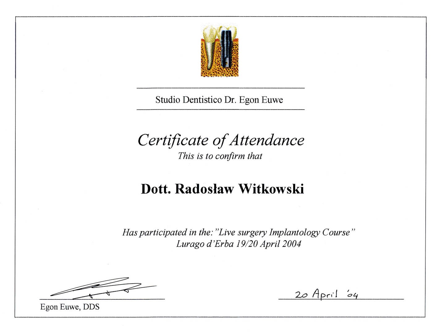 Certyfikat 2004.04.19 szkolenie Lurago dErba Wlochy
