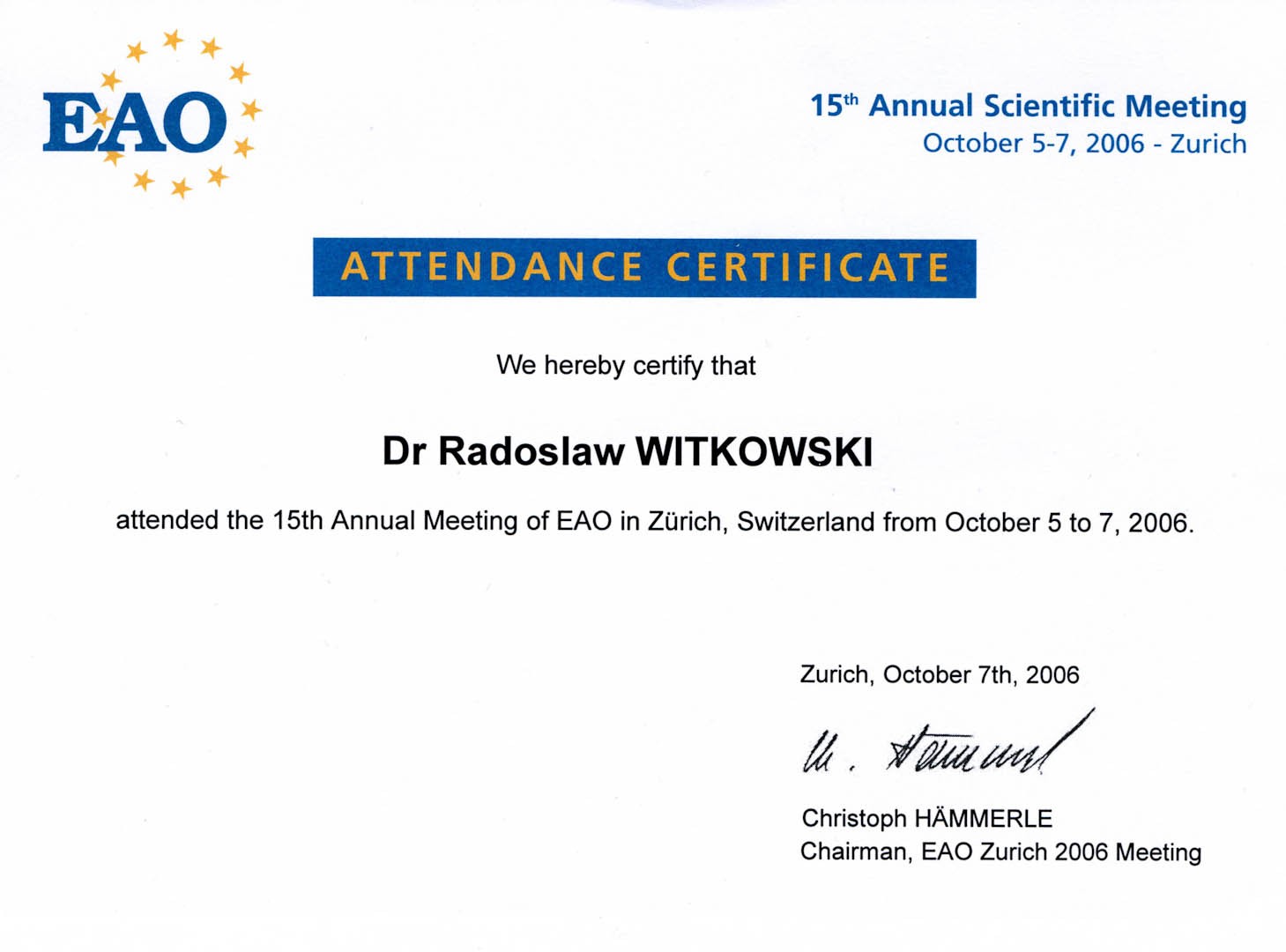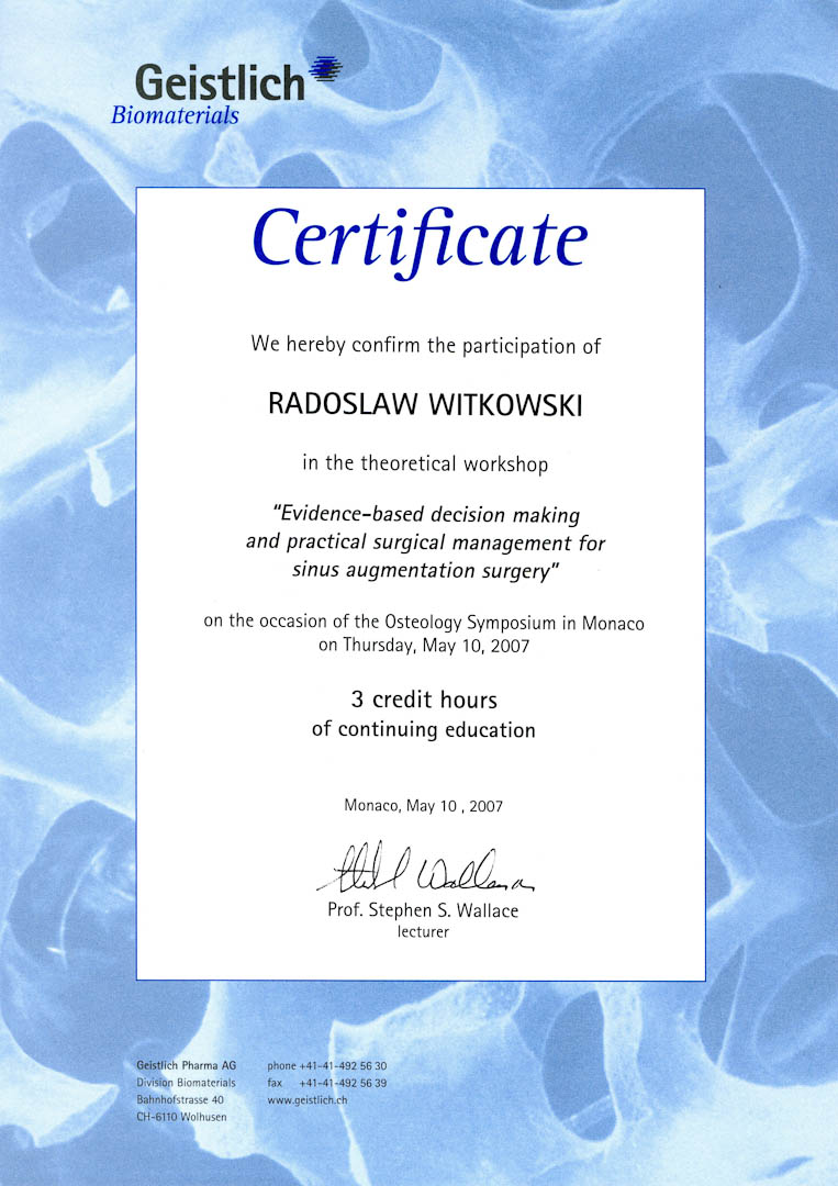 Certyfikat 2006.10.07 szkolenie Zurych Szwajcaria