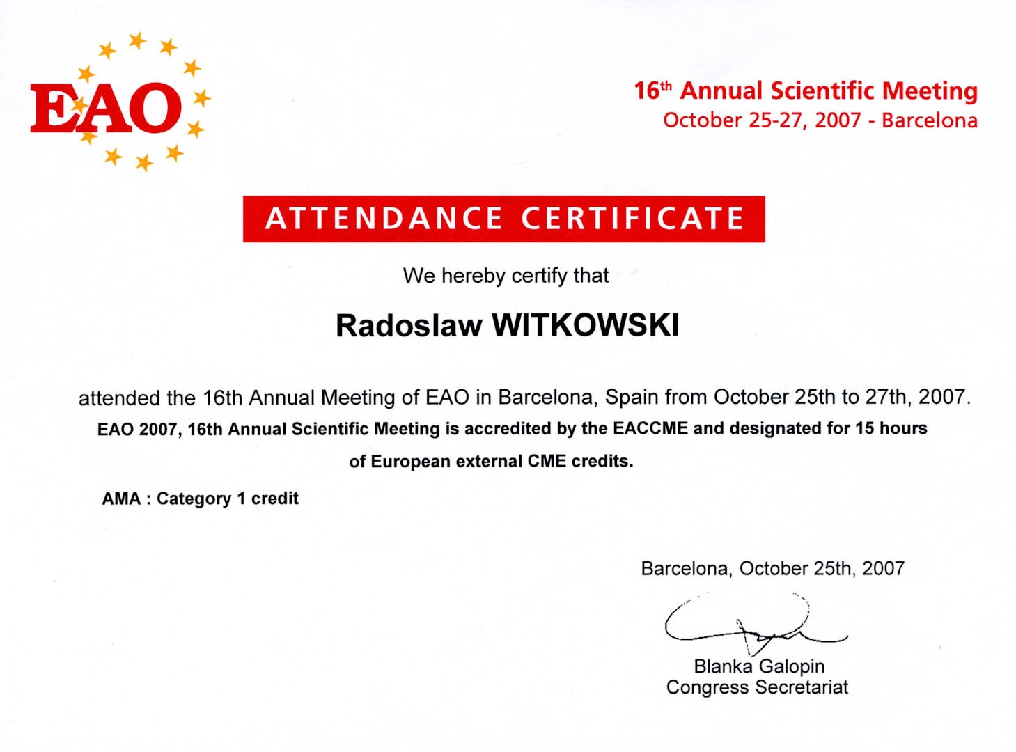 Certyfikat 2007.10.25 szkolenie Barcelona Hiszpania