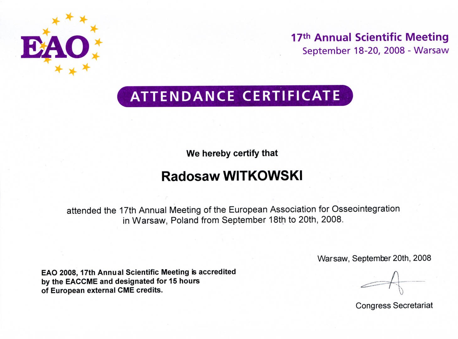 Certyfikat 2008.09.20 szkolenie Warszawa