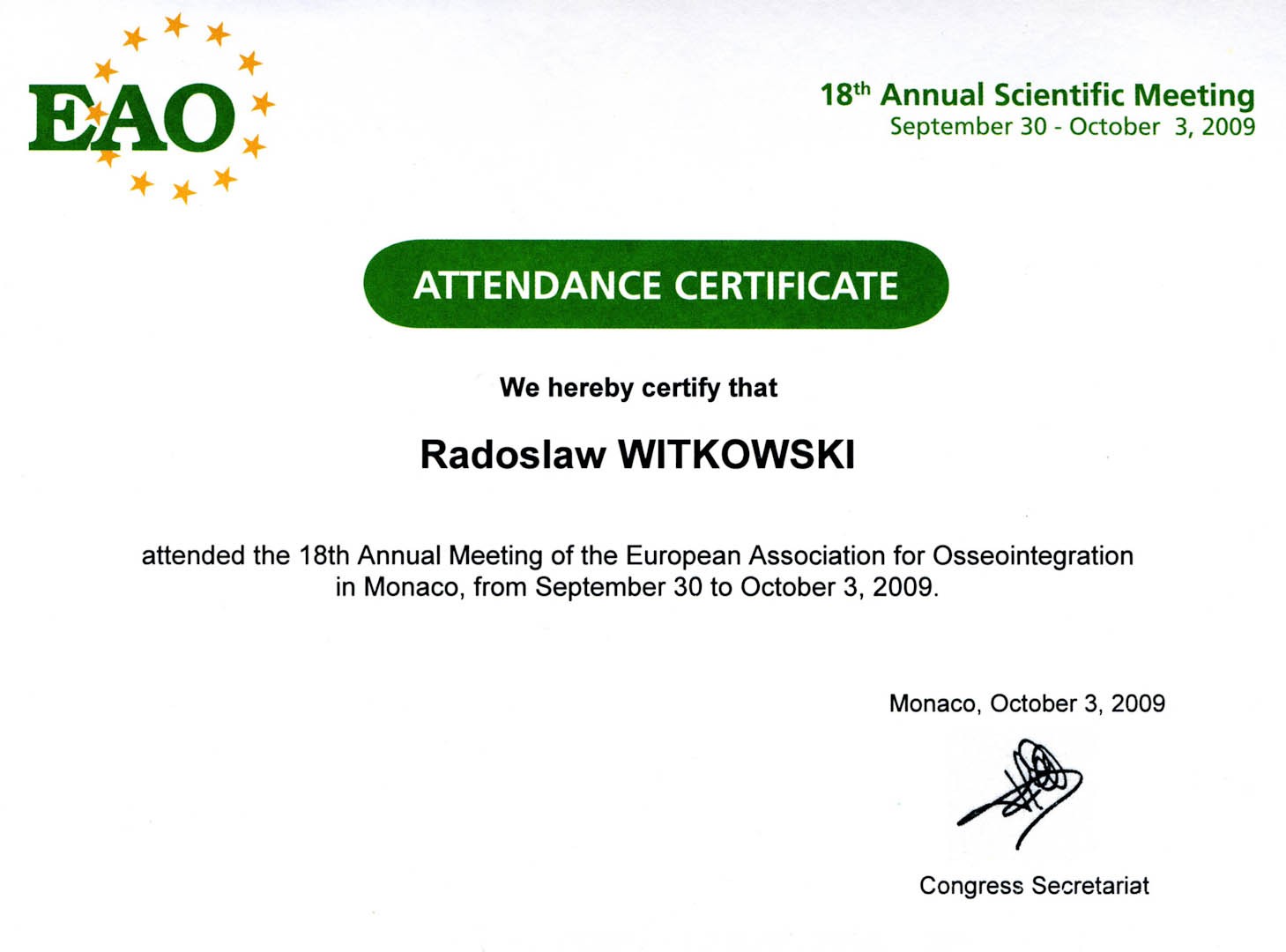 Certyfikat 2009.10.03 szkolenie Monako