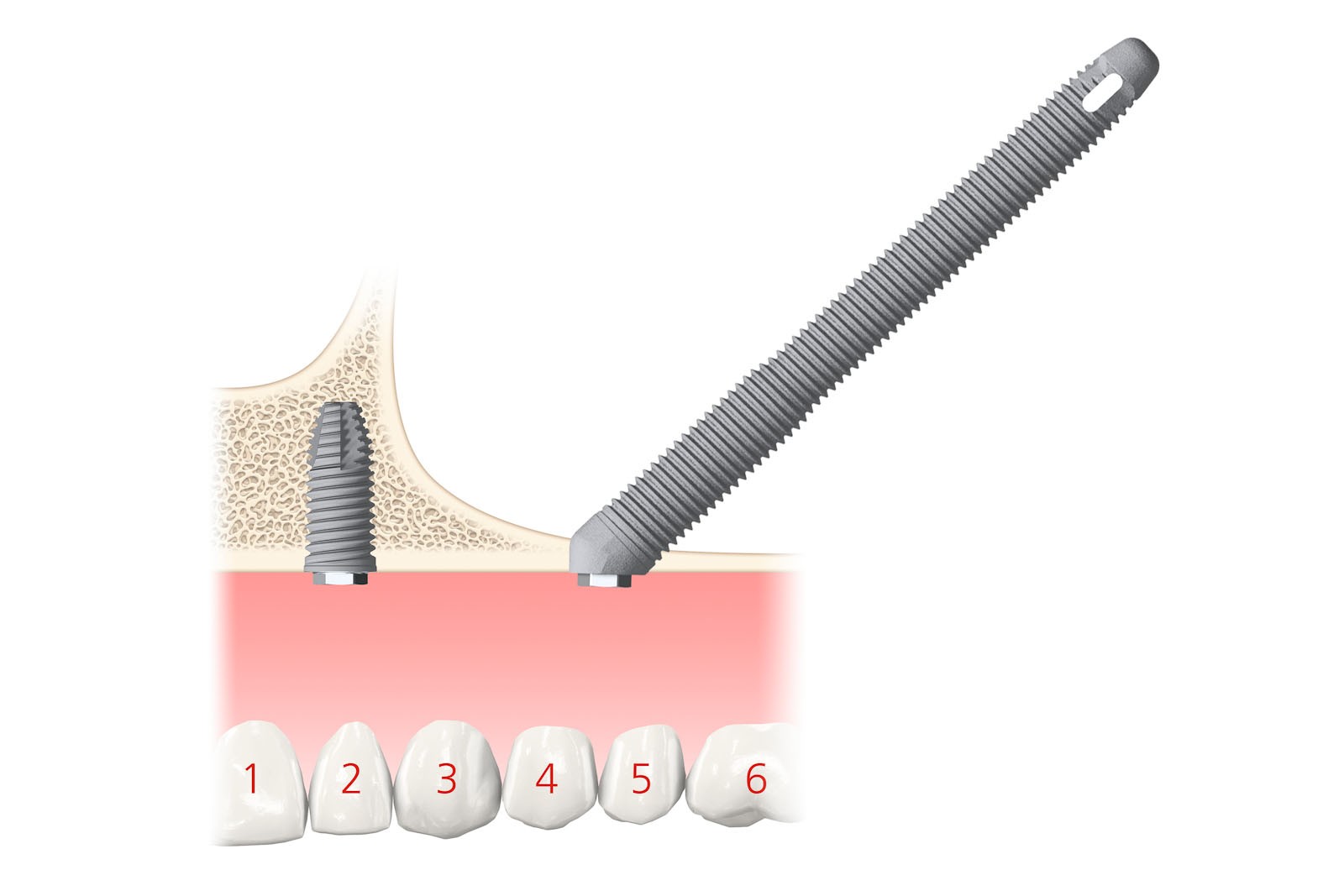 U pacjentów z brakiem wystarczającej ilości kości szczęk w odcinkach bocznych oraz przednim, by założyć tradycyjne, krótkie implanty, wprowadza się symetrycznie po dwa implanty jarzmowe Zygoma po każdej ze stron. Pomocne bywają również tzw. implanty skrzydłowe, które po wprowadzeniu stabilizowane są w wyrostkach skrzydłowych kości klinowych, które zrastają się z tylnymi obszarami szczęk tzw. guzami szczęk. Są to implanty mocowane w jamie ustnej z tyłu, za typową pozycją implantu Zygoma.