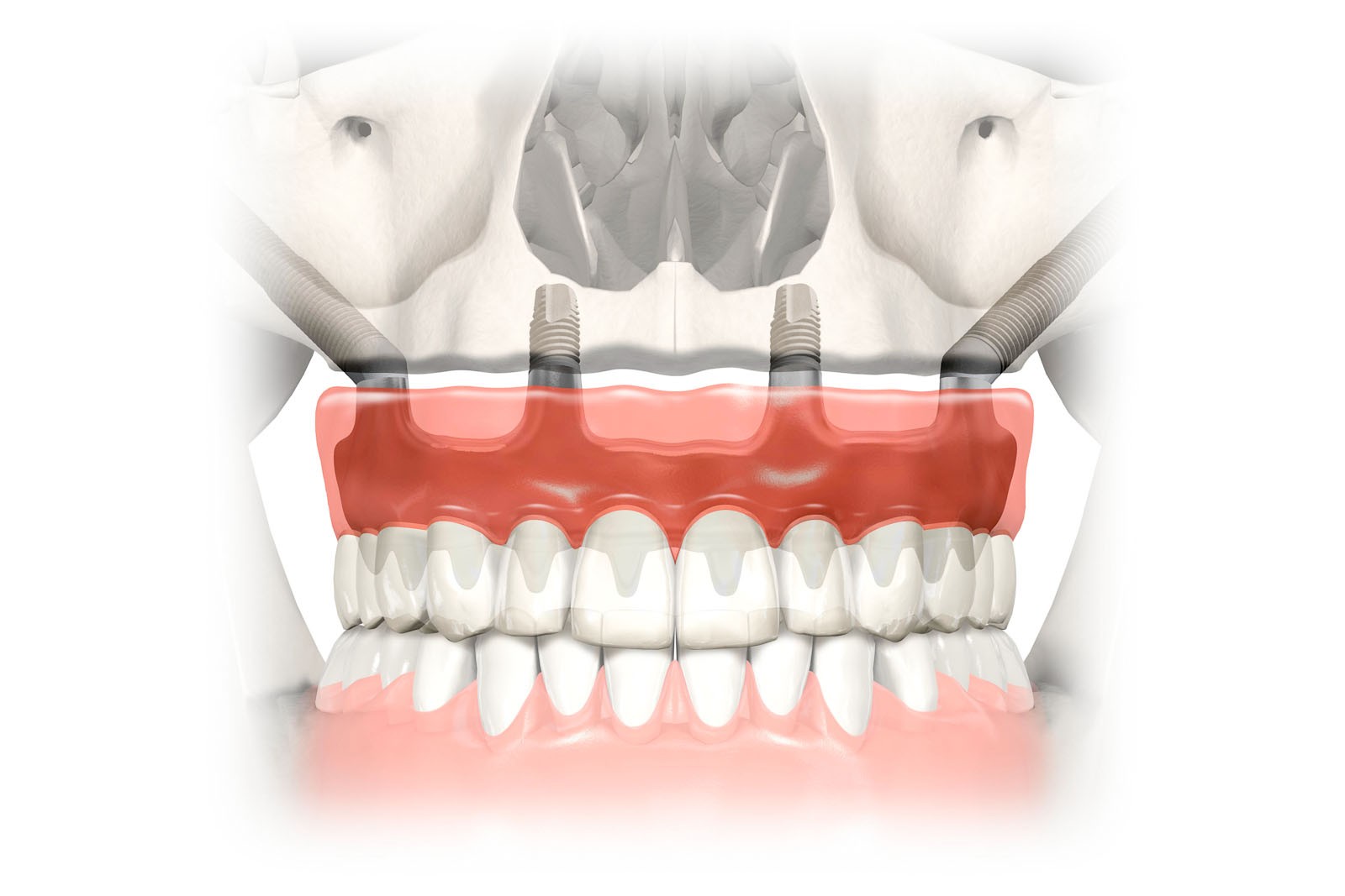 2 implanty jarzmowe, 2 lub 4 krótkie implanty korzeniowe, 4 lub 6 łączników MultiUnit, natychmiastowy tymczasowy most wykonany z akrylu, o ile jest to możliwe.