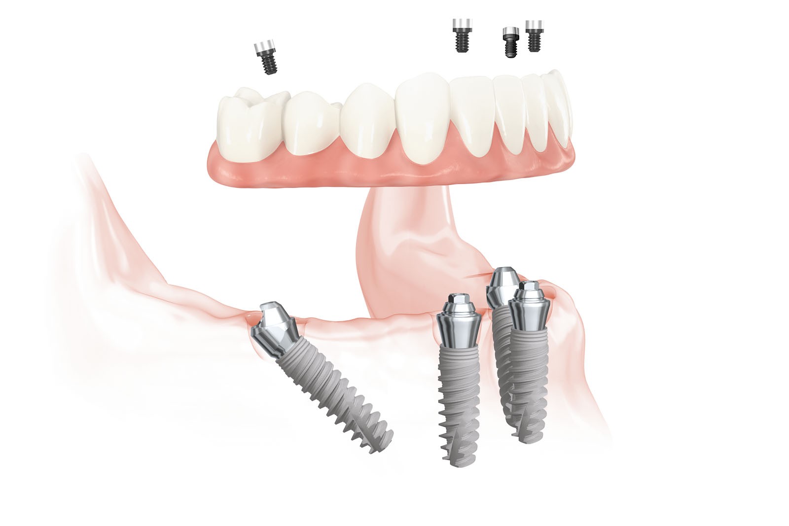 - Implantacja równolegle i symetrycznie wszczepionych implantów z maksymalnym wykorzystaniem podłoża kostnego żuchwy. Proponowana ilość implantów to 4, 6, 8, 10 oraz każda inna w zależności od stanu kości oraz projektu uzupełnienia protetycznego. Implantacje często łączone są z procedurami regeneracyjnymi dla kości, które stanowią warunek prawidłowego wgajania wszczepów stomatologicznych.