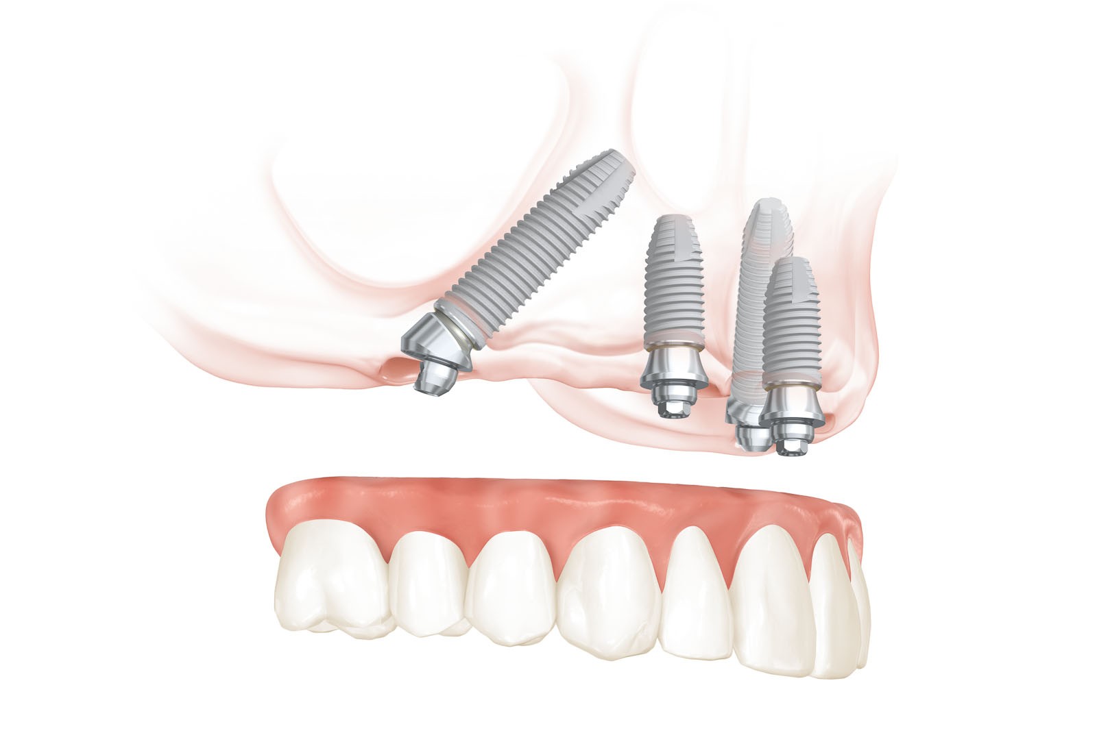 - ALL-ON-4 to sprawdzona i przewidywalna metoda odbudowy uzębienia na implantach dla bezzębnych pacjentów. To opatentowany system rehabilitacji implantoprotetycznej oparty na 4 wszczepionych implantach, gdzie 2 środkowe są wprowadzone równolegle, 2 skrajne – skośnie, pod kątem 45 stopni.