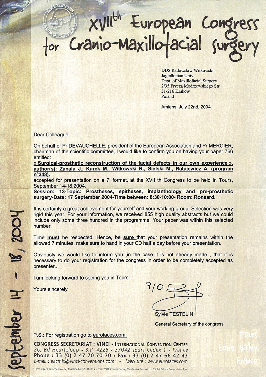 Odległe wyniki leczenia operacyjnego progenii w materiale własnym. Stanisław B. Bartkowski, R. Witkowski. III Kongres Polskiego Towarzystwa Chirurgii Jamy Ustnej i Chirurgii Szczękowo-Twarzowej, Szczecin, 17-19 maja 2001 s. 187 : abstr. 3
